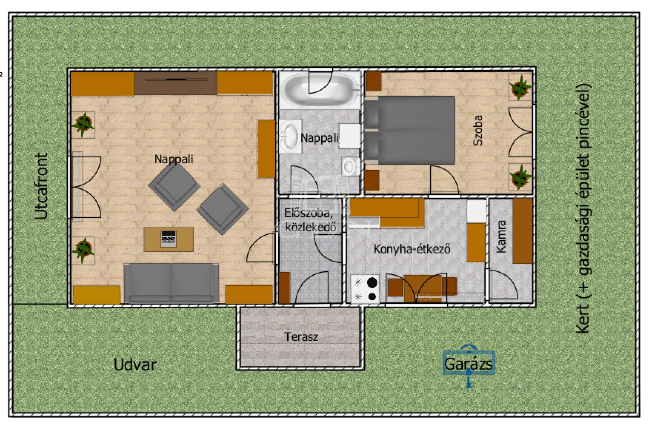 A 2 utca felől megközelíthető 390 m2-es telken egy külön álló (részben pincézett) statikailag jó állapotban lévő gazdasági épület, valamint egy önálló garázs (15 m2) is helyett kapott! .