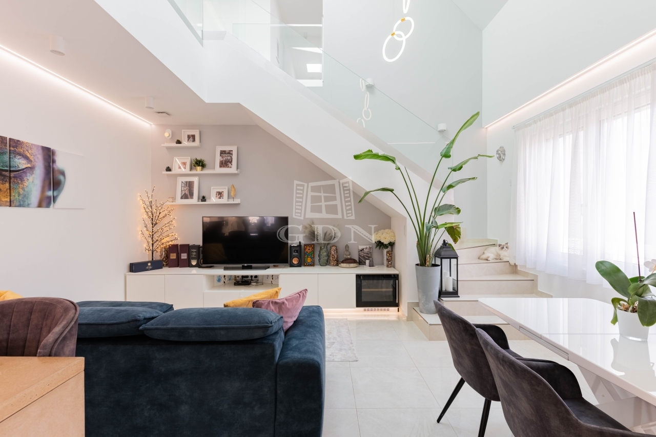 A lakás különlegessége a belső kétszintes kialakítás, amely tágas, jól elkülönülő élettereket biztosít.
