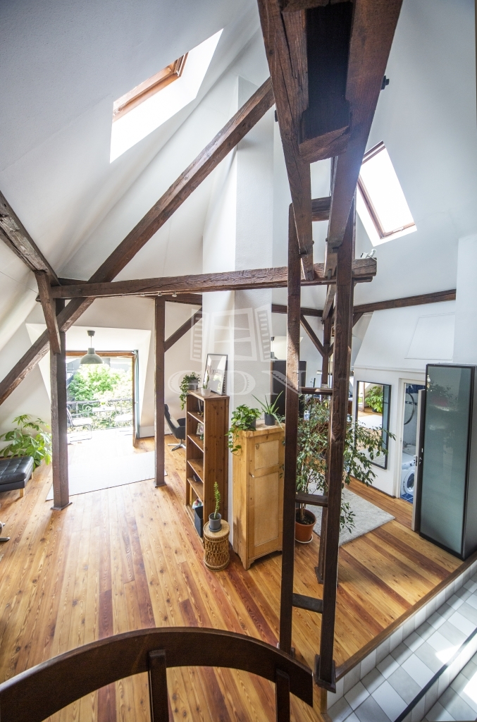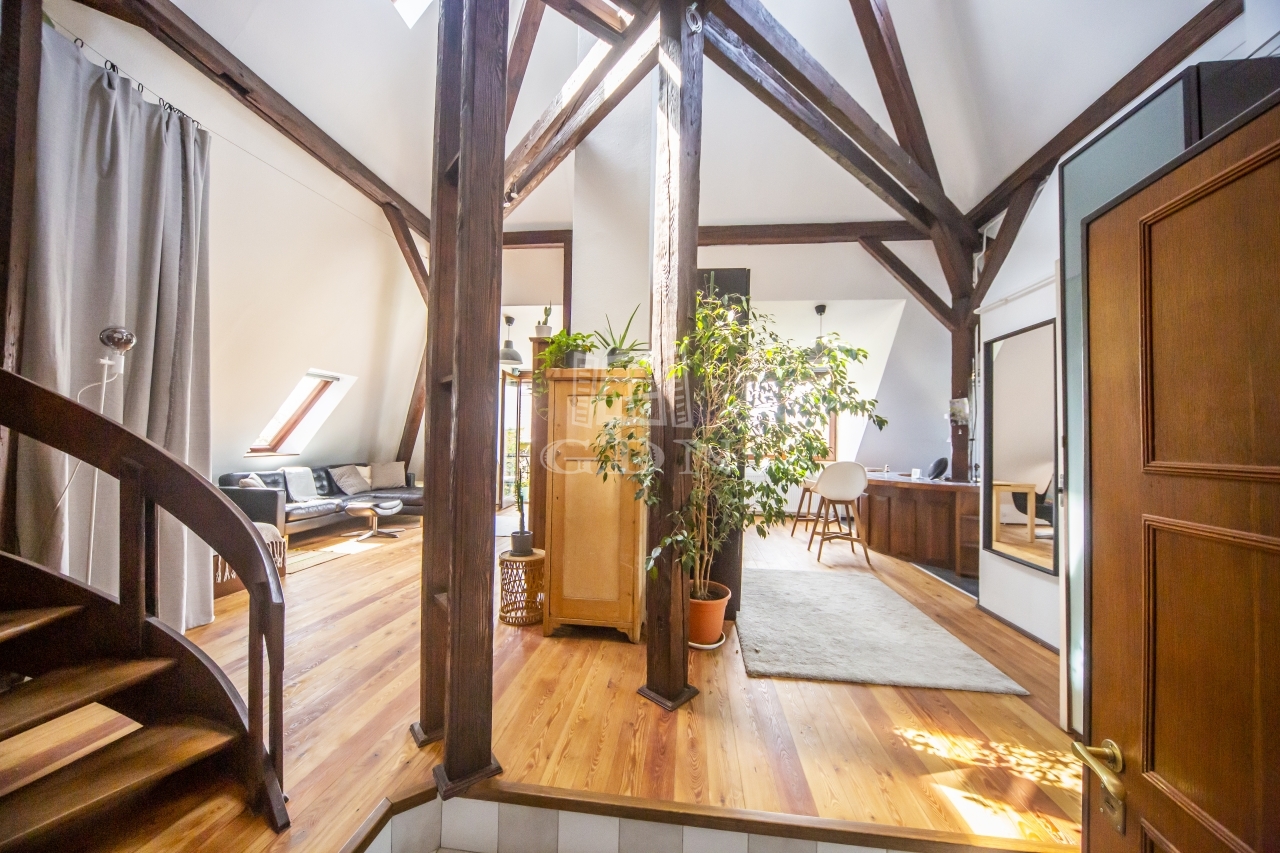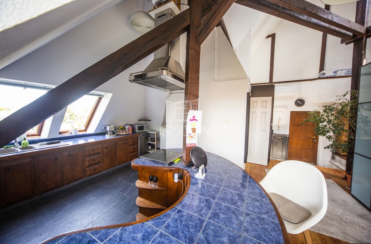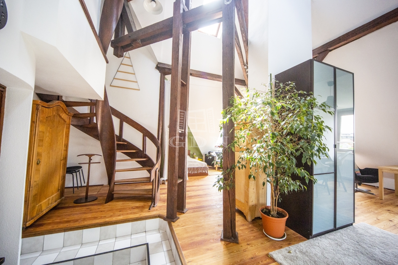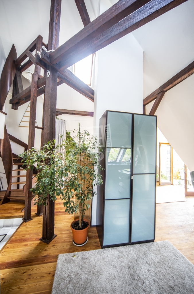 Az újonnan beépített klímával felszerelt lakás belső átriumos kialakítása, valamint a terek elrendezése egyértelműen a klasszikus művész lakás hangulatát árasztja.