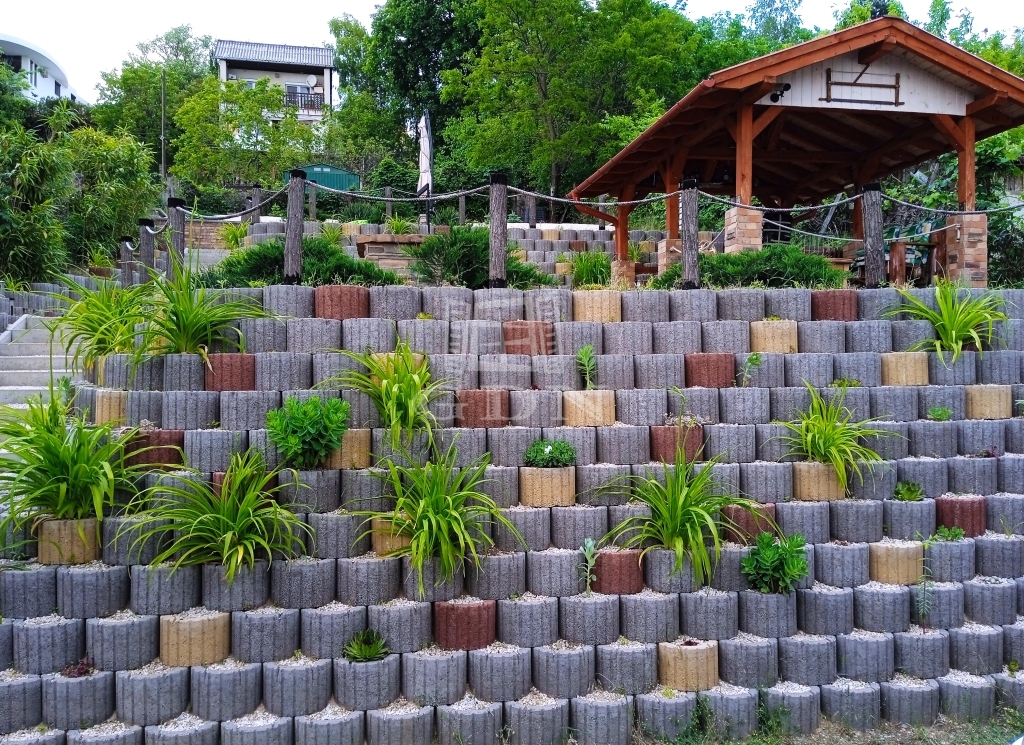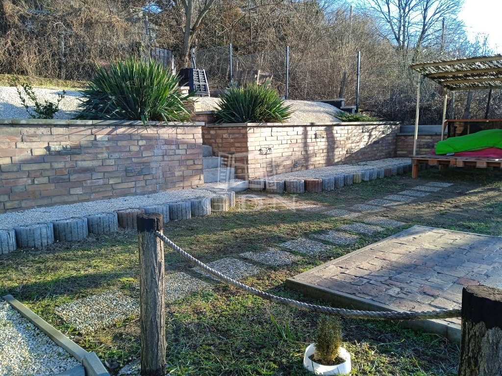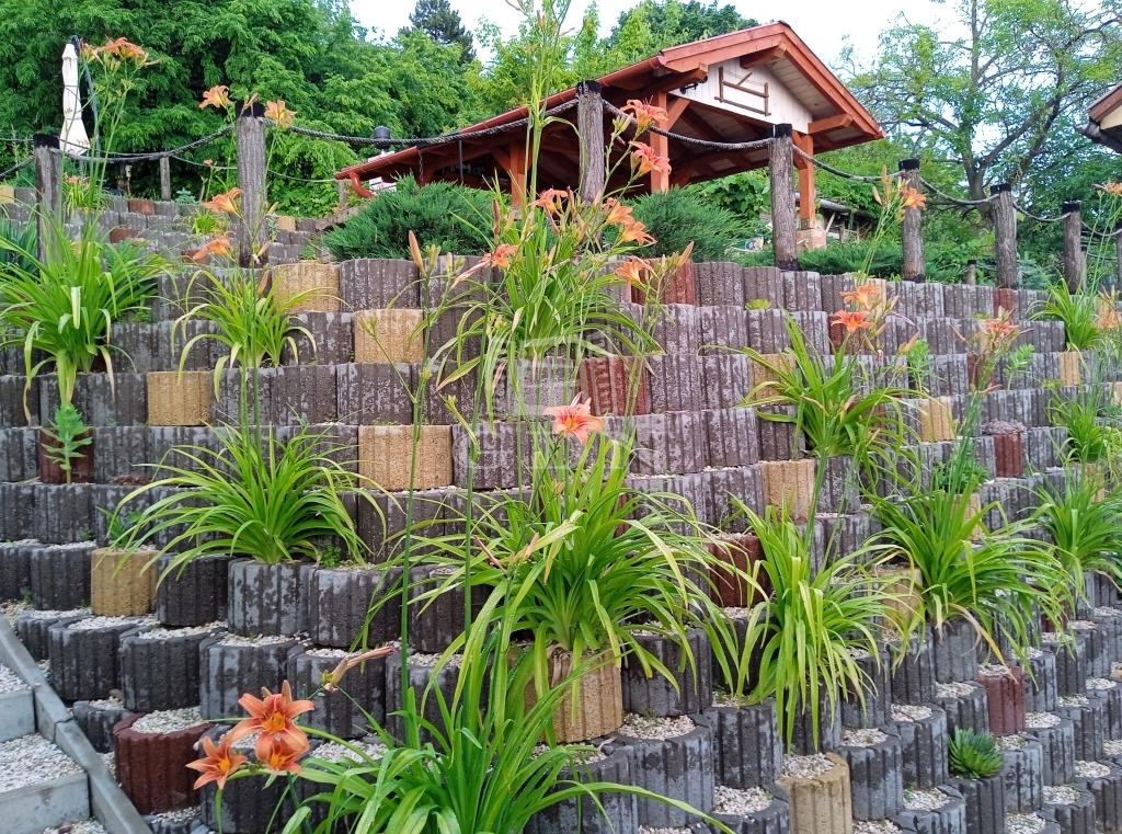 A lejtős telek lépcsőzetes kialakítást kapott. Ennek köszönhetően, különböző szinteken vízszintes felületek kerültek kialakításra.