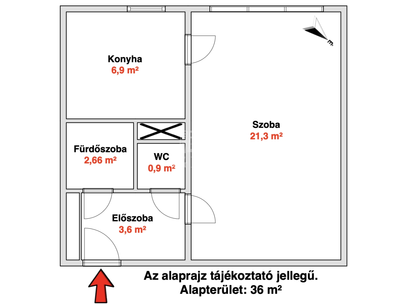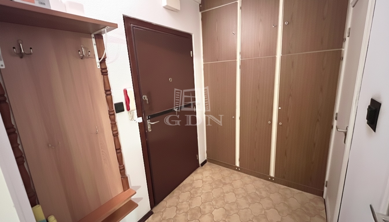 Az előszobából külön nyílik a fürdőszoba és a WC, itt kapott helyet egy beépített gardróbszekrény is. A tágas, padlószőnyeggel burkolt szobából nyílik a konyha, amely ablakos, konyhabútorral felszerelt.