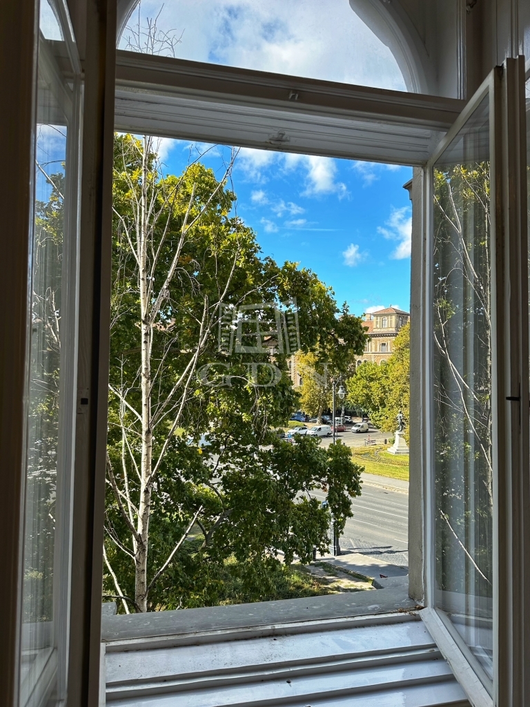 A szoba ablakai a Kodály Köröndre néznek, aminek minden évszakban meg van a maga bája.