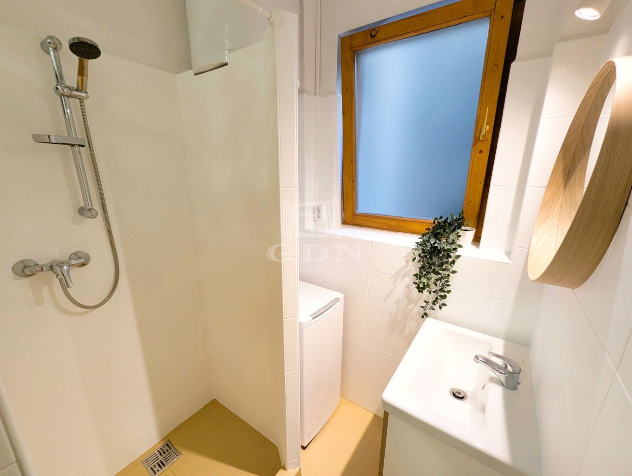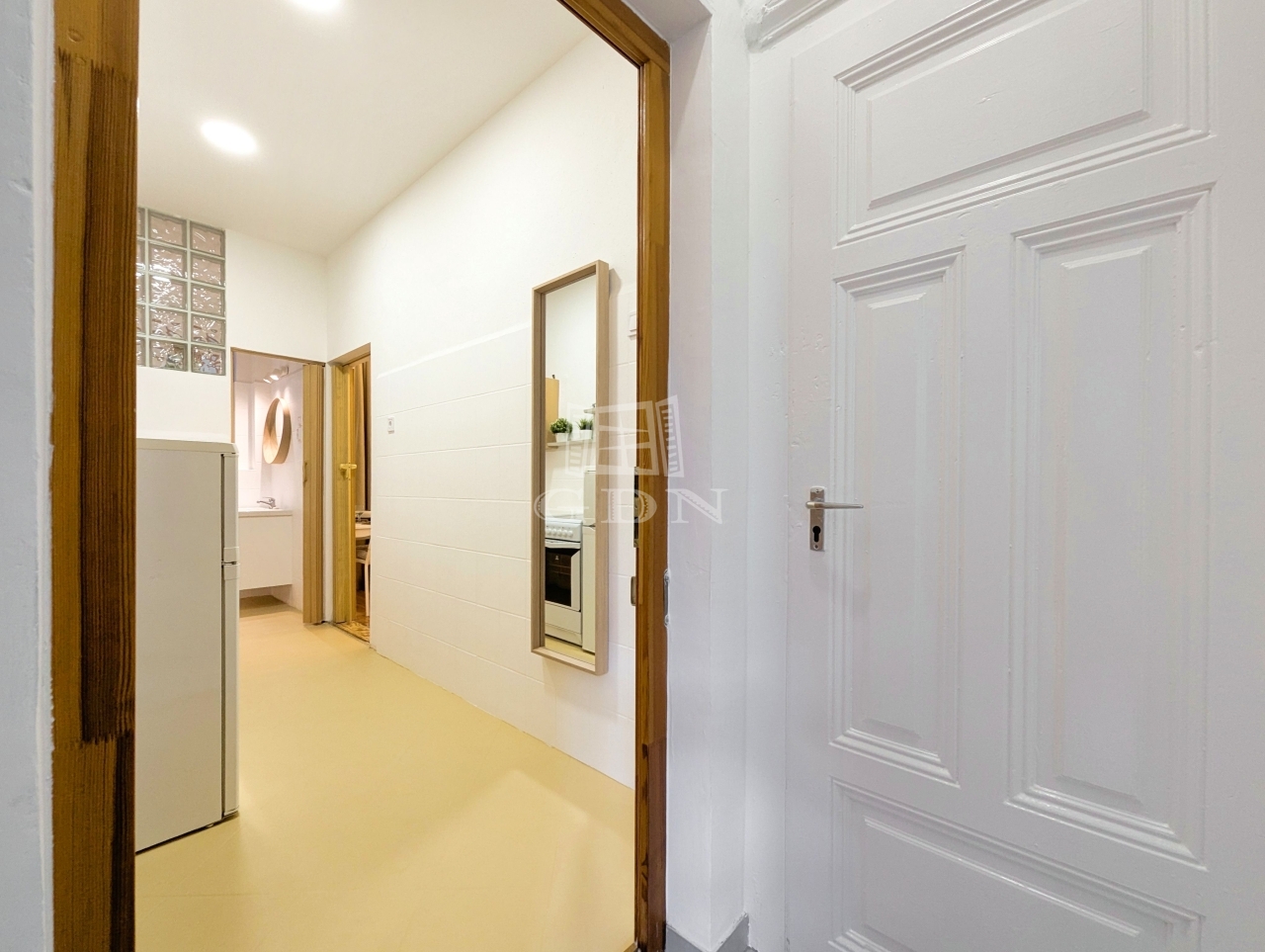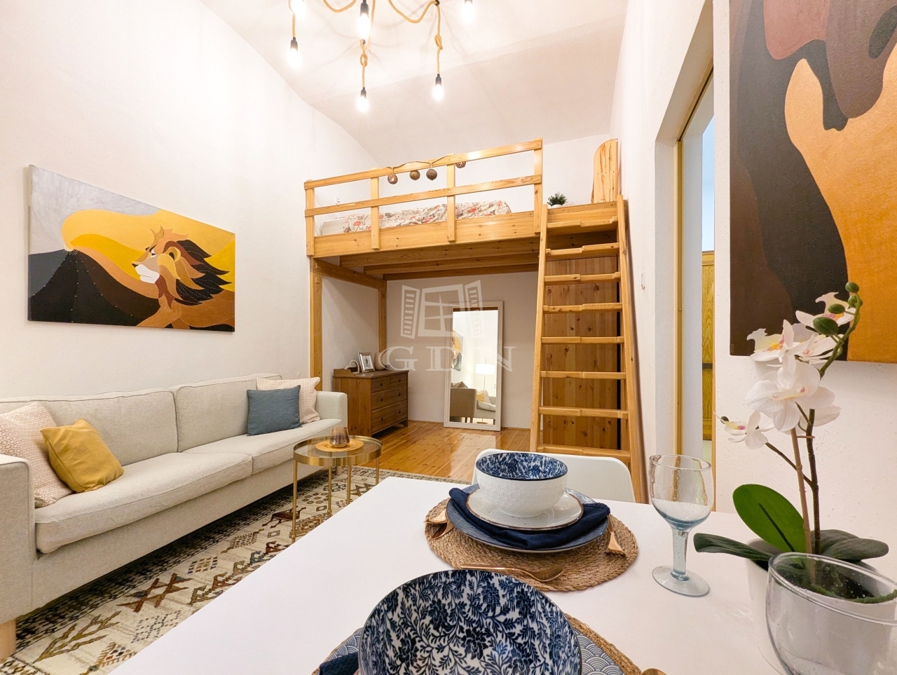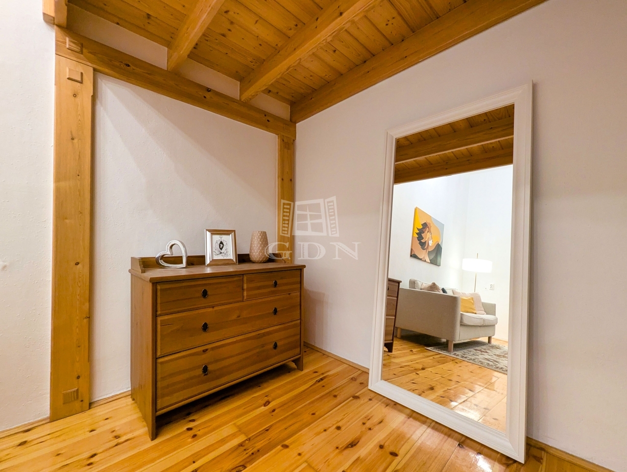 A lakást letisztult fehér falak és meleg tónusú faelemek jellemzik, ablakai nem az utcára néznek, így a lakás rendkívül csendes.