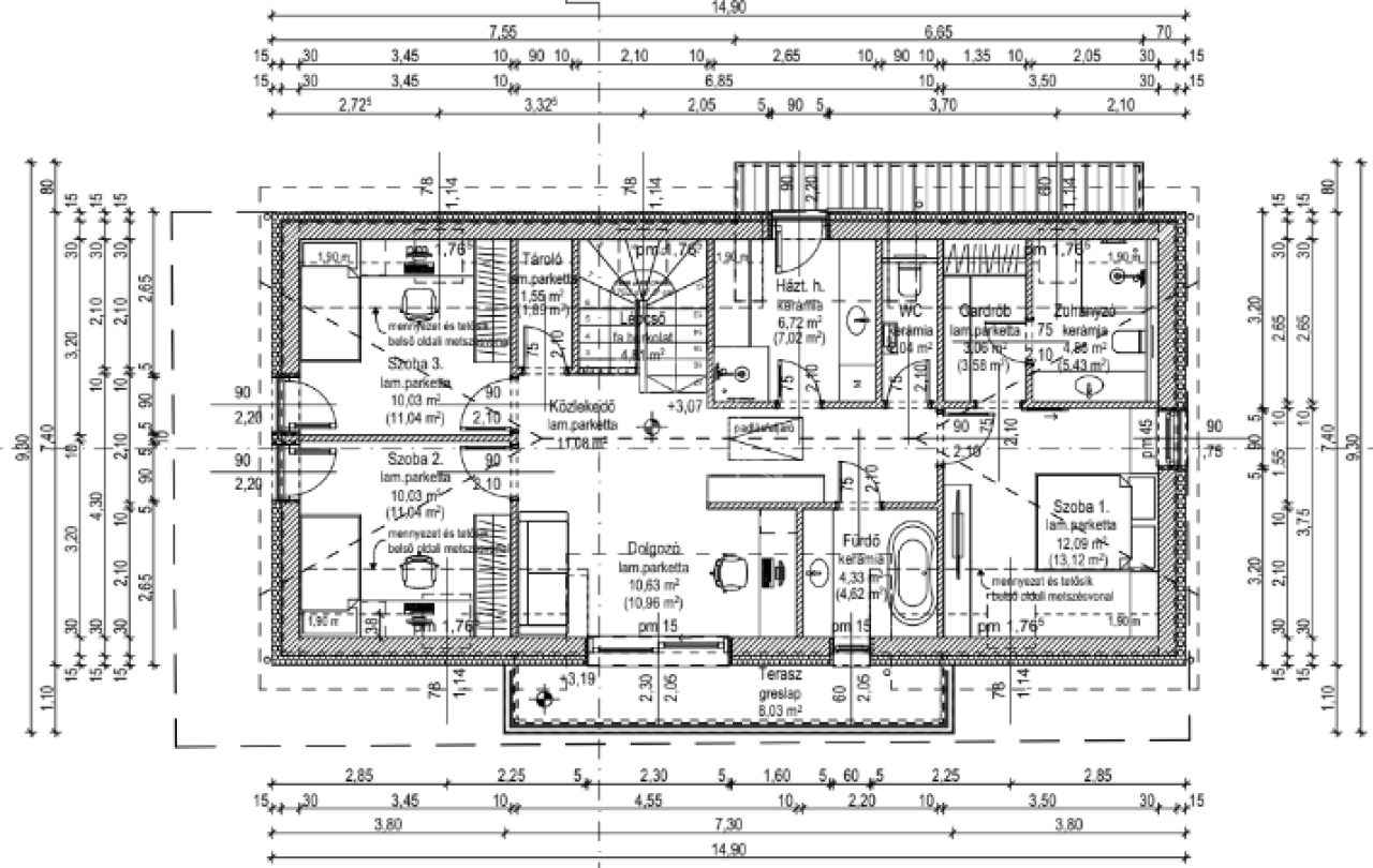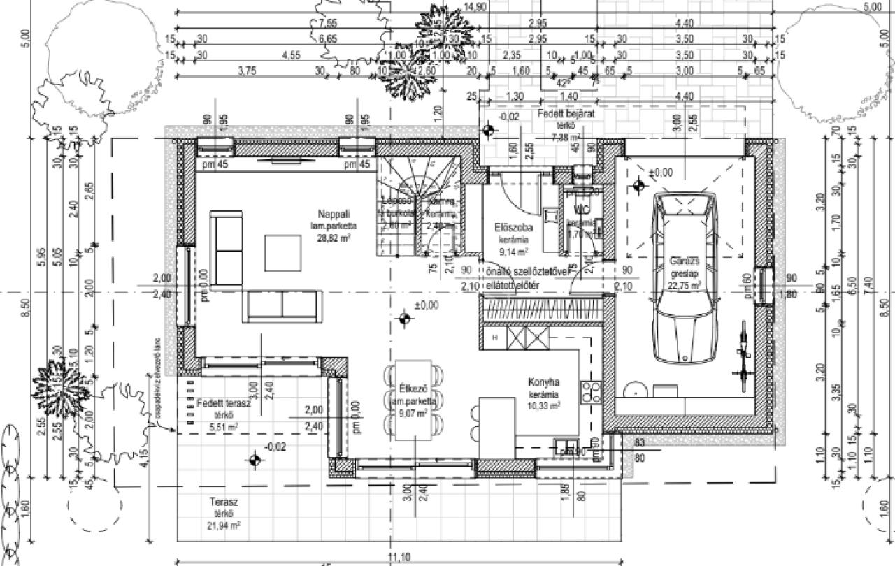 A nettó 145 m2 alapterületű otthonhoz 22,75 m2 garázs tartozik.