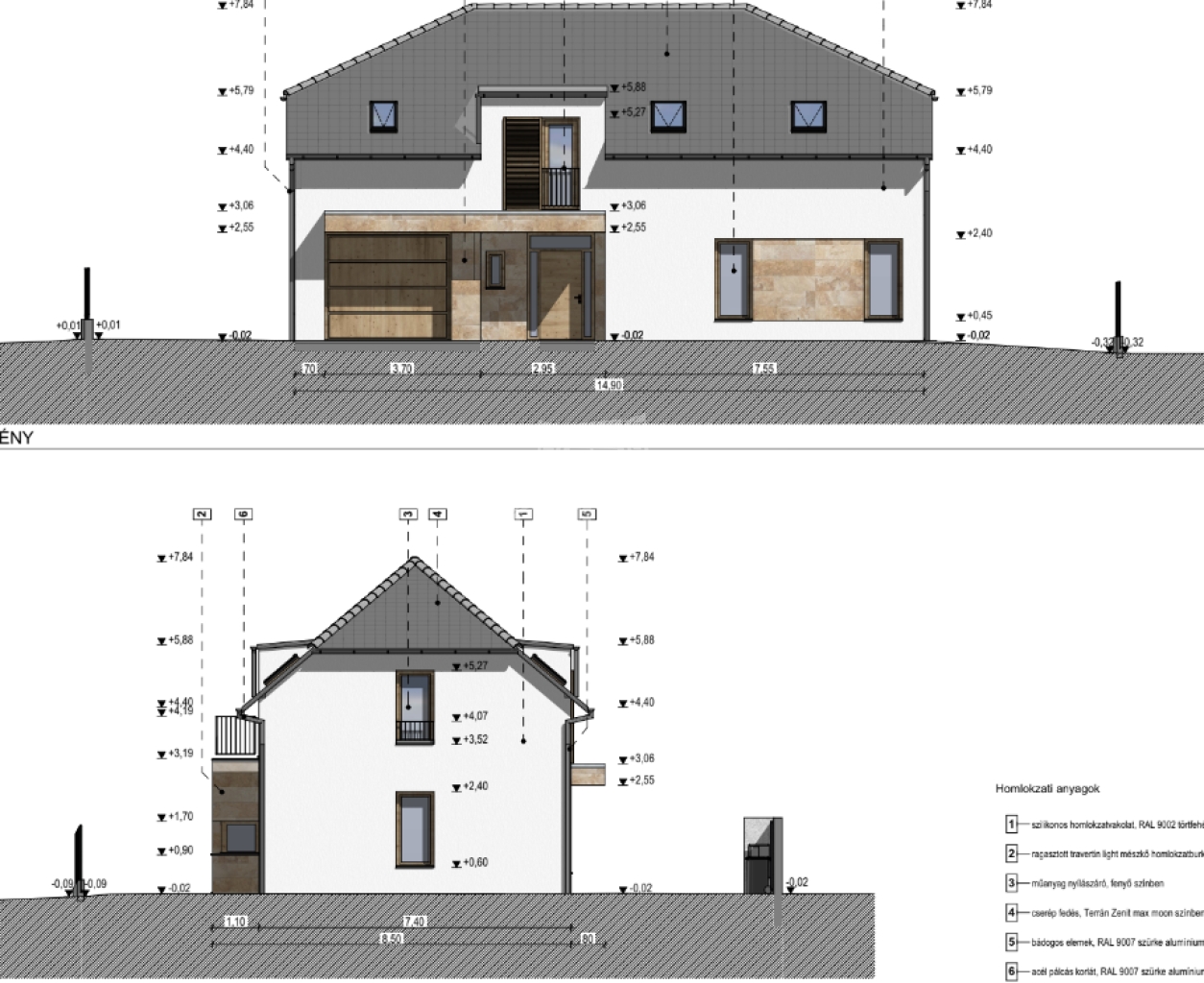 A tető Terrán Zenit Max cserépfedést kap elegáns Moon szürke színben. A nyílászárók korszerű, háromrétegű hőszigetelt üvegezésű, fenyő színű műanyag szerkezetek, többpontos biztonsági bejárati ajtóval.