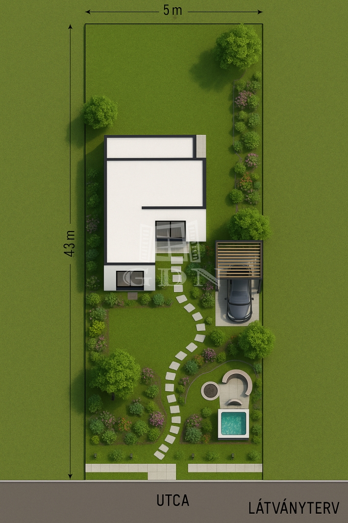 Előkertnek kötelezően el kell hagyni min.5métert max.10m.