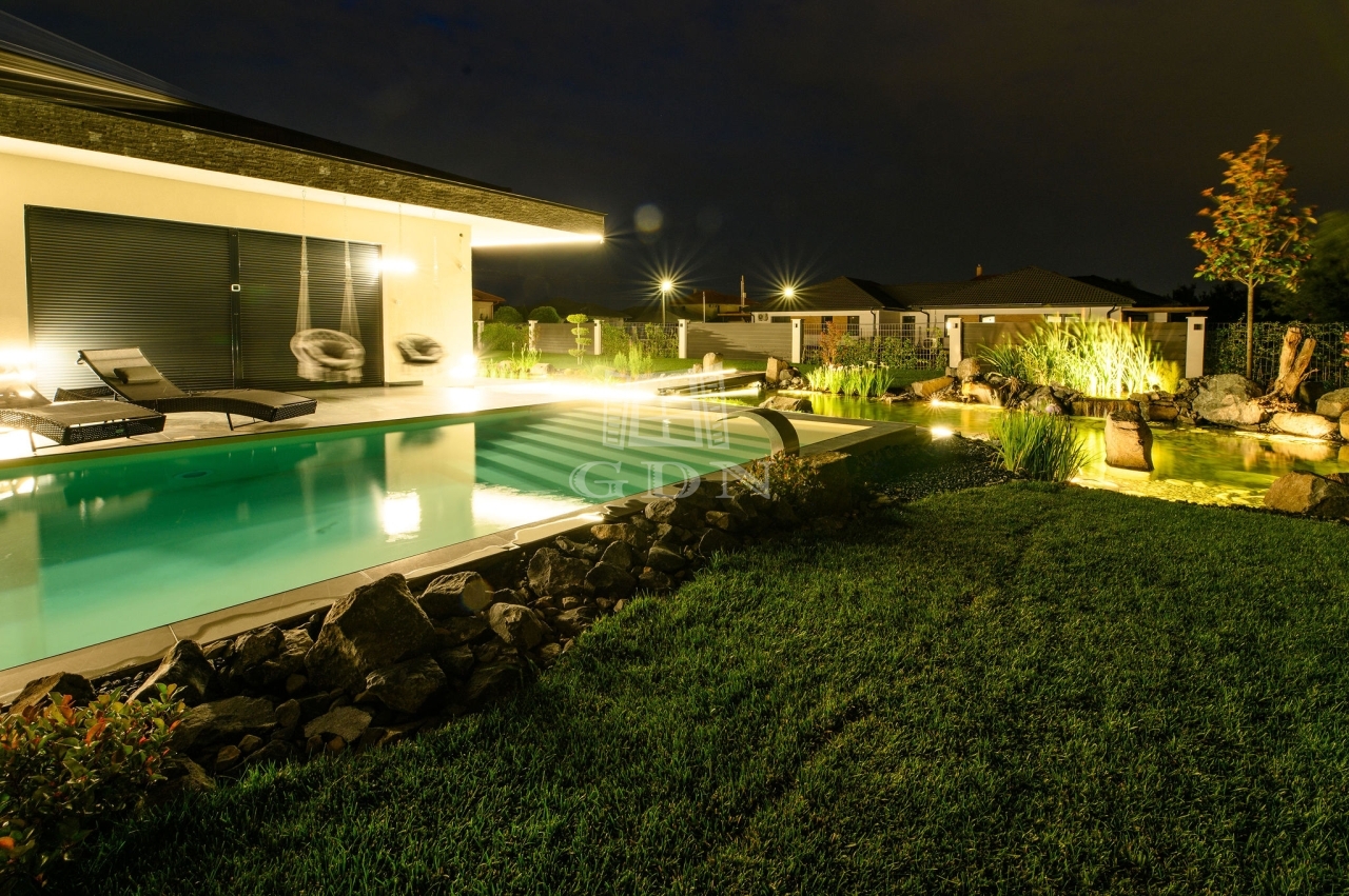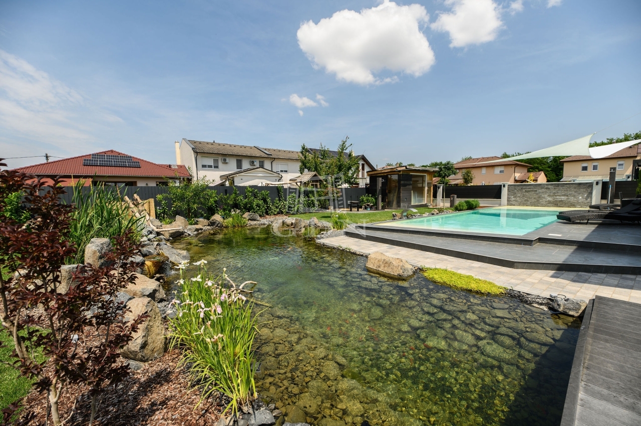 •A gondozott kertben egy 15x4 méteres, LEDVILÁGÍTÁSSAL, vízeséssel ellátott 60m2-es medence, valamint 30 méteres, öntisztuló kerti tó is helyet kapott.