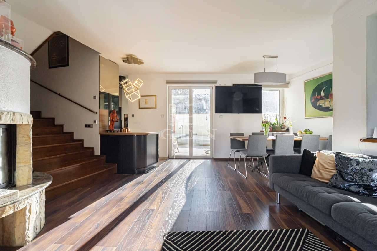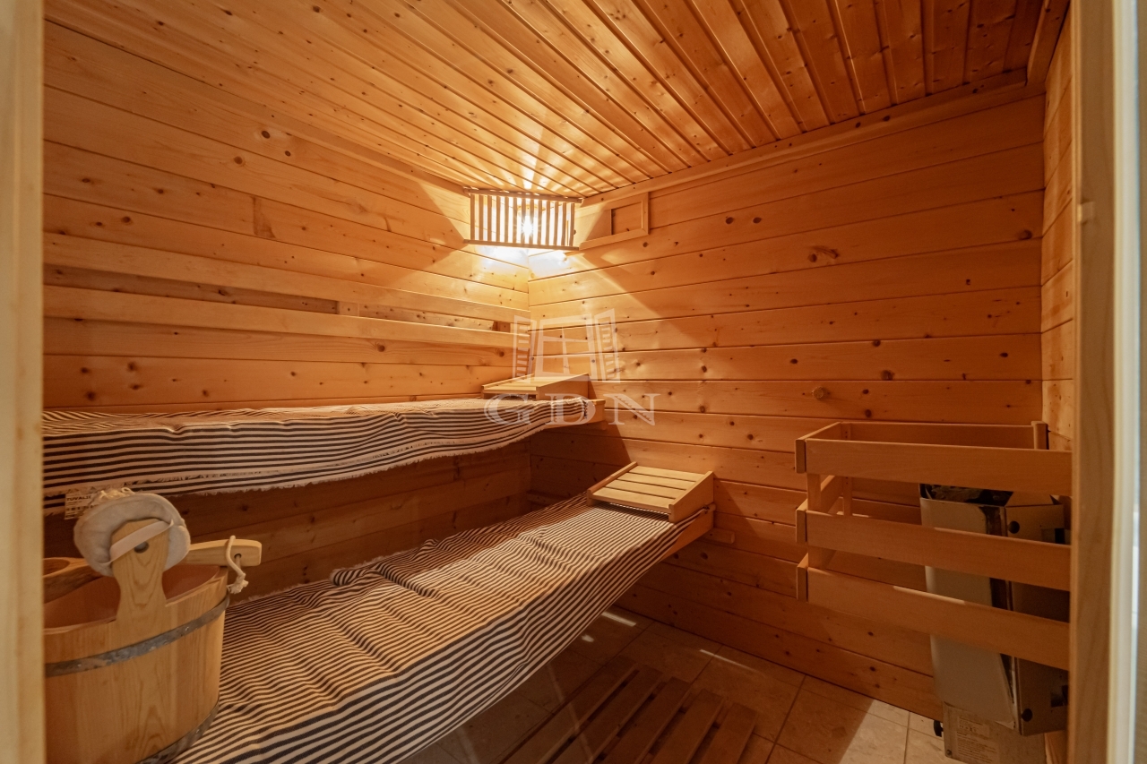 A ház különlegessége a saját wellness szint, ahol egy szauna, jakuzzi és sófallal ellátott pihenőtér is helyet kapott – tökéletes kikapcsolódás az év bármely napján. Emellett összesen 5 szoba és 4 fürdőszoba szolgálja a kényelmet, köztük egy teljes szülői lakrész panorámás terasszal.
