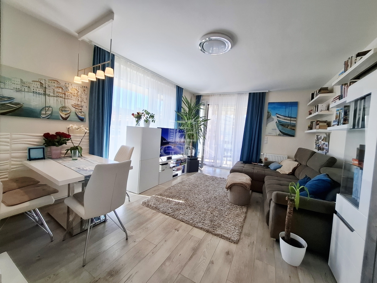 A nappaliból két erkélyajtón keresztül is megközelíthető a tágas, 34 m²-es erkély, amelyet körben árnyékolók tesznek még komfortosabbá.