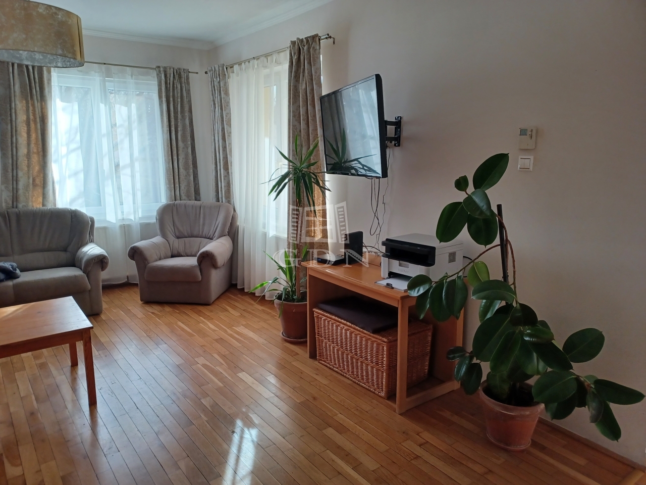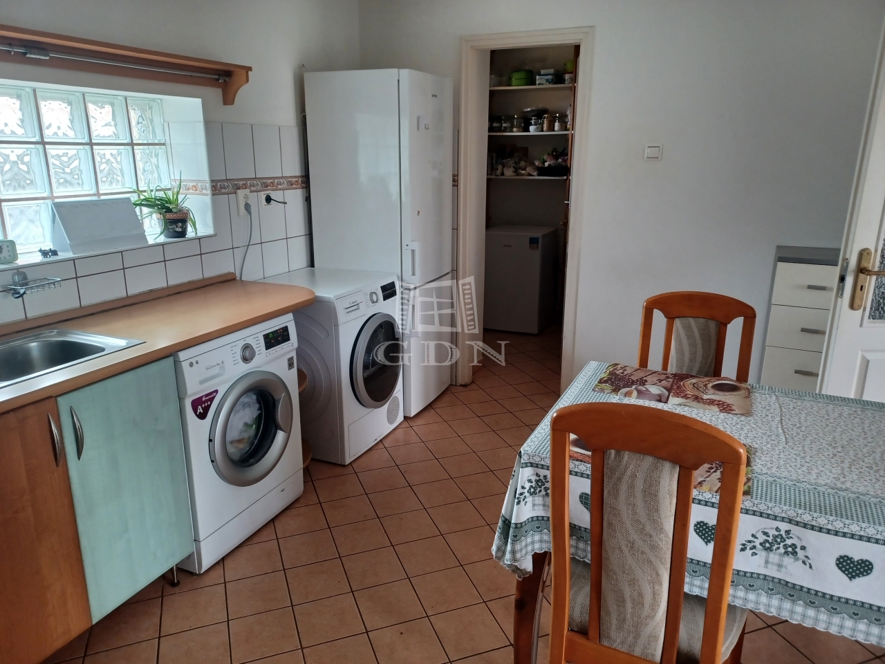 A ház tágas terekkel rendelkezik: nappali + 3 hálószoba, előszoba, közlekedő, étkező + konyha, kamra, gardrób, kádas és zuhanyzós fürdőszoba, külön wc. A ház mellett van a kazánház és a garázs, alatta egy 12 nm-es pince húzódik.