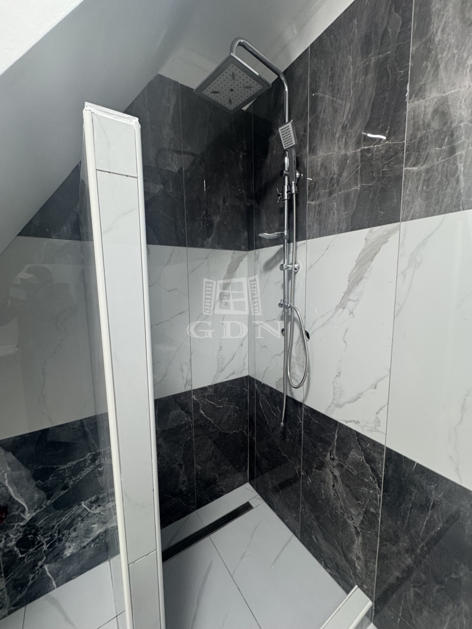 az alsó szinten egy külön nyíló szoba, egy tágas, amerikai konyhás nappali, valamint egy modern, zuhanyzós fürdőszoba került kialakításra.