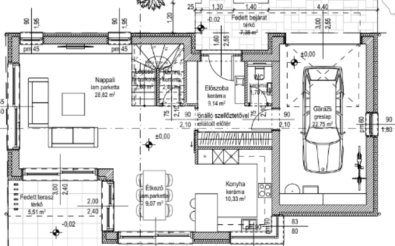 A nettó 145 m2 alapterületű otthonhoz 22,75 m2 garázs tartozik.
