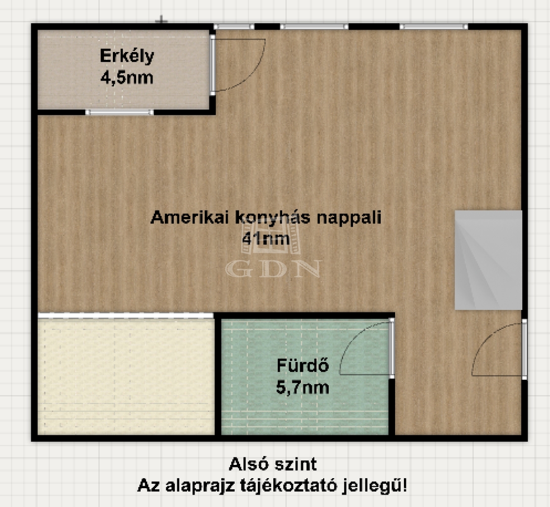 A lakás alsó szintjén egy 41nm nagyságú amerikai konyhás nappali az abból nyíló 4nm-es erkély, valamint a közel 6nm-es zuhanyzós fürdő kapott helyet.