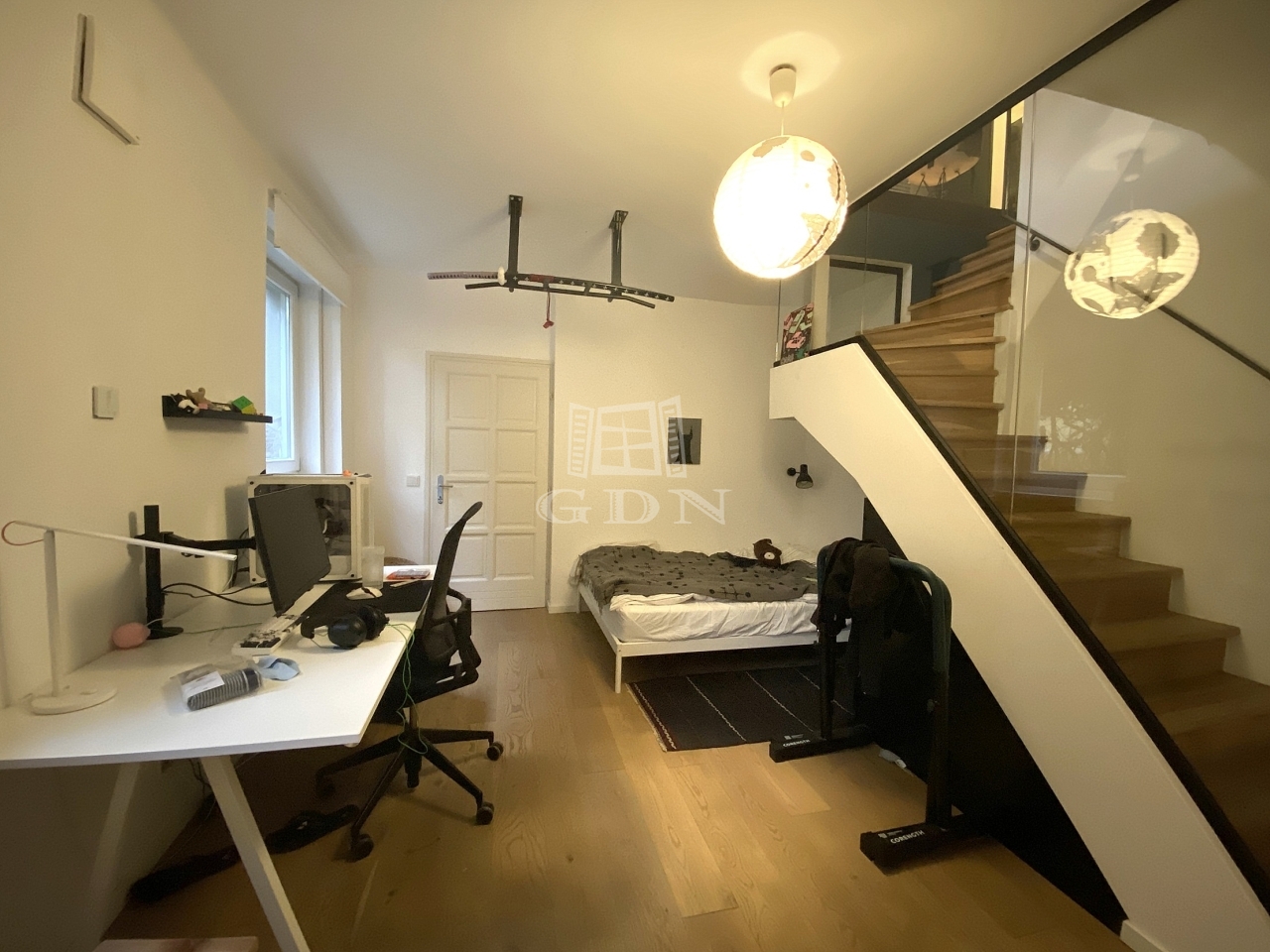 A lakás belső kétszintes. A lakás bejárata a felső szintre nyílik, itt egy hatalmas, egy légtérben elhelyezkedő nappali, étkező, konyha található, valamint egy hálószoba és egy fürdőszoba.