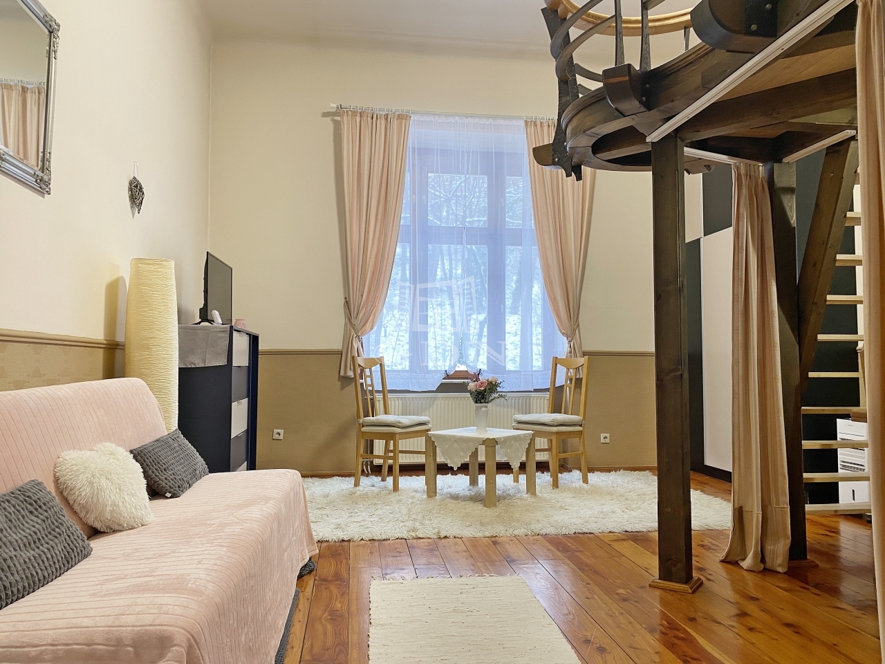 Az ebédlőből lépünk a 25 nm-es utcai kilátással rendelkező szobába. A szoba életterét növeli a látványos- különlegesen megmunkált épített 6 nm-es álló galéria.