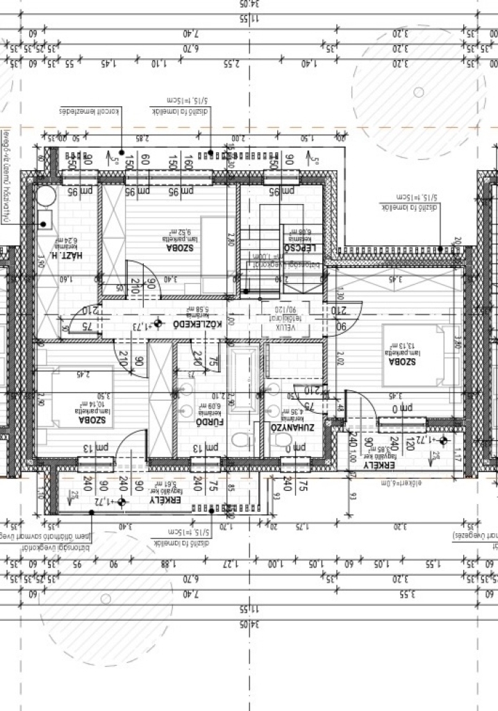 Az emeleten három hálószoba, fürdőszoba, külön zuhanyzó és háztartási helyiség került kialakításra, kényelmes közlekedőkkel.