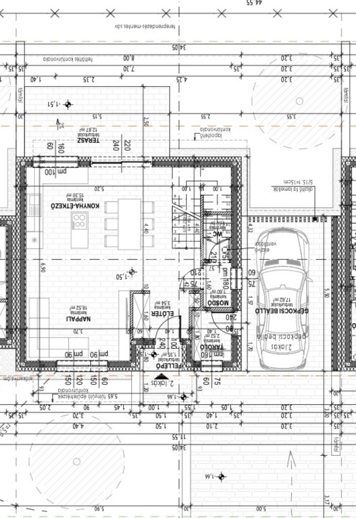 ingatlanonként két gépkocsi számára biztosított, ebből egy parkolóhely a ház előtti területen kialakítható.