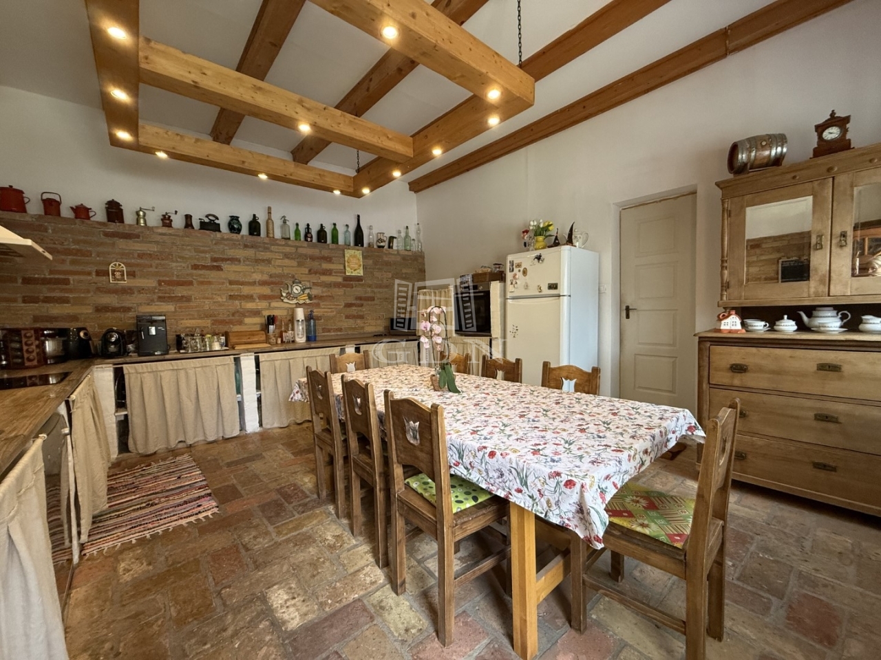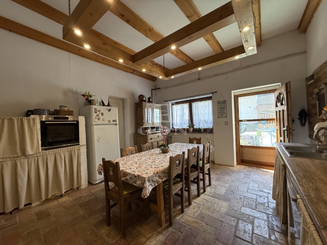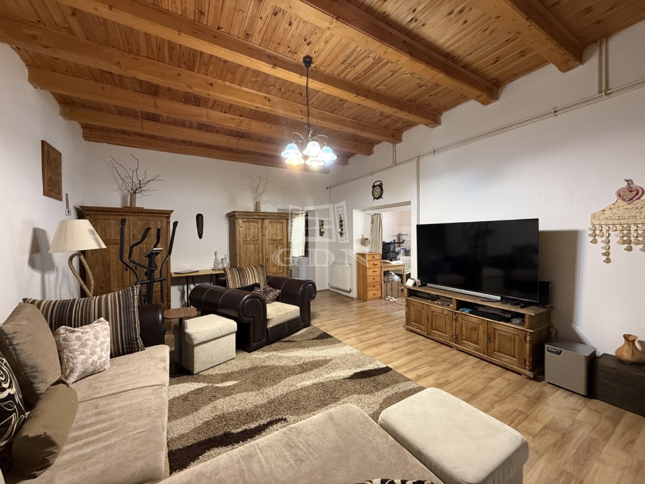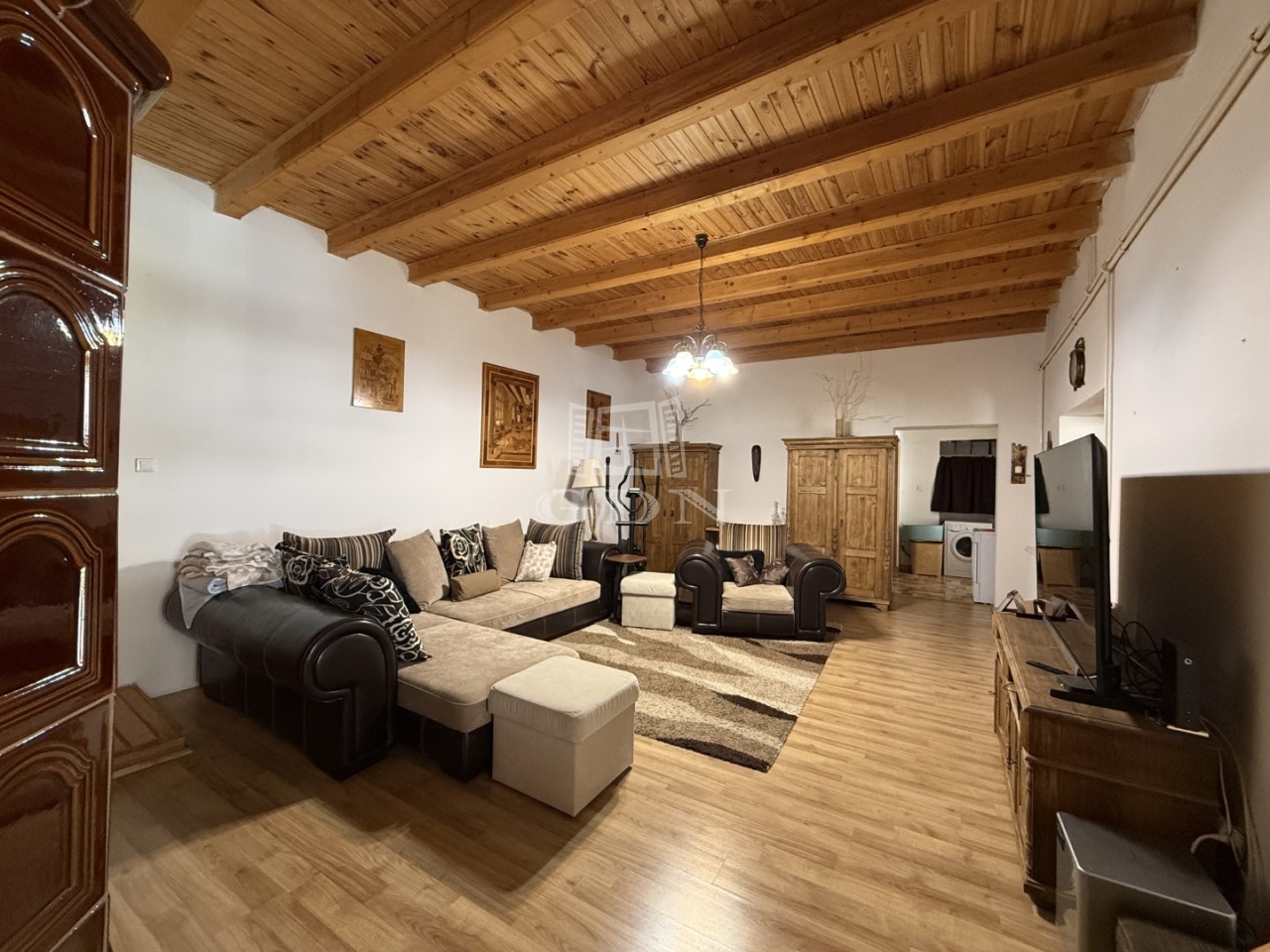 • Földszinti lakás (93 m²): rusztikus hangulatú, előszoba, konyha-étkező, tágas, világos nappali (35 m²), hálószoba, fürdő (zuhanyzós), külön WC, háztartási helyiség. Hangulatos, látszógerendás mennyezet és cserépkályha teszi különlegessé.