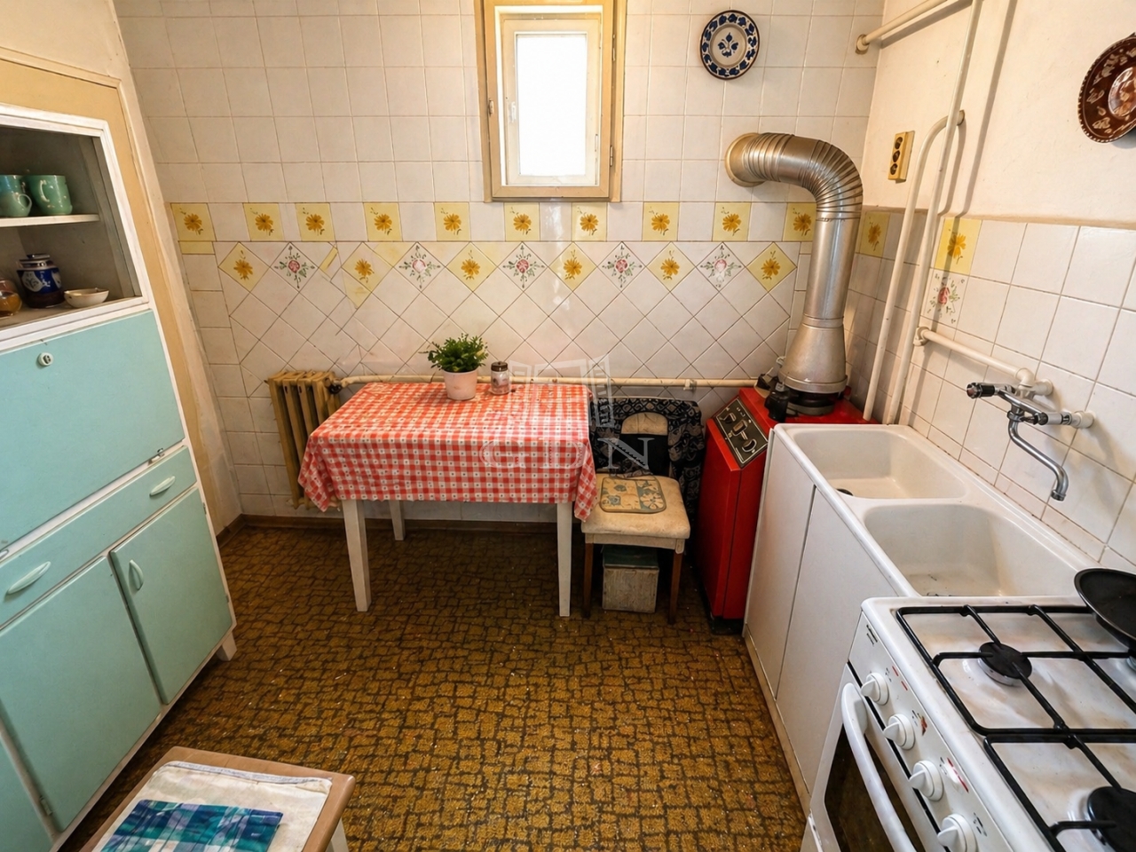 Fűtése Éti-típusú gázkazánról és vegyes-tüzelésű kazánról vezérelt központi fűtés radiátoros hőleadókkal, a kisebb szobában gázkonvektor kiegészítéssel.