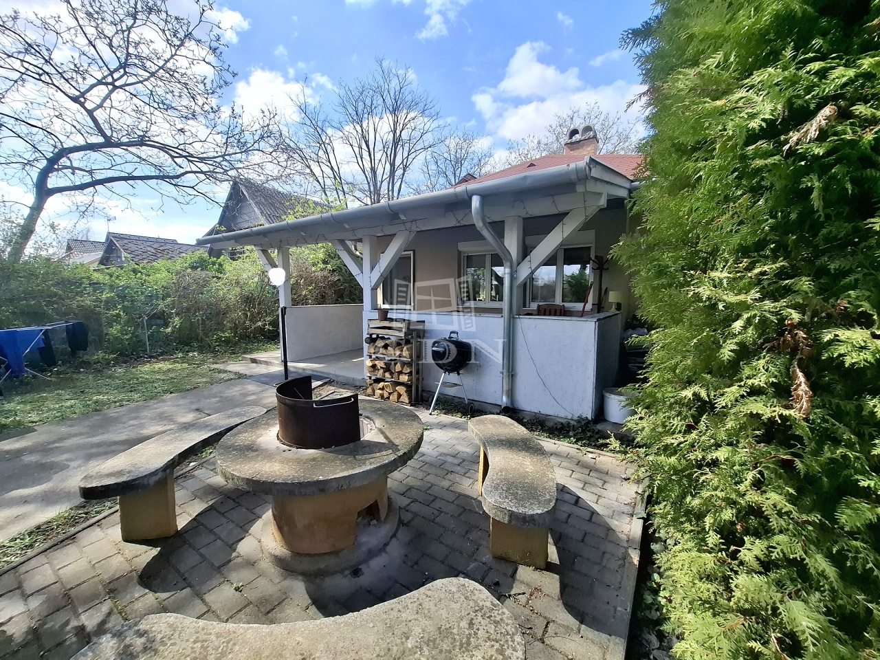 A kertben 20 m2 fedett kerti tároló került kialakításra melybe bevezetére került víz, villany, csatorna egy nyári konyha kialakítását lehetővé téve, valamint rendelkezésre áll egy tűzrakó is itt elkészülhet a kifogott halakból a halászlé!